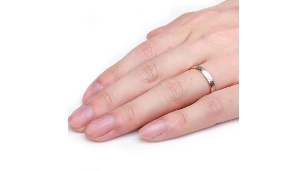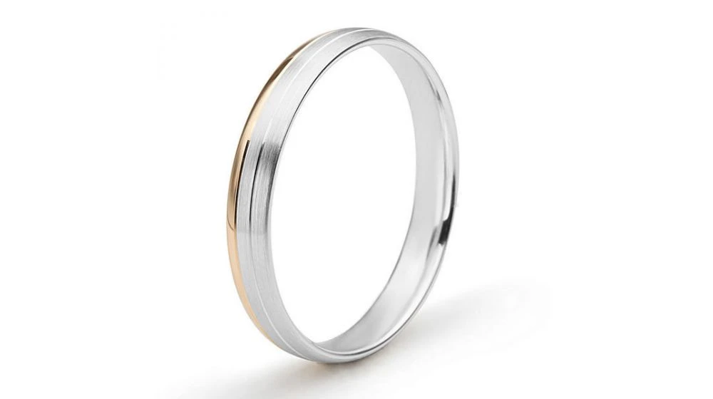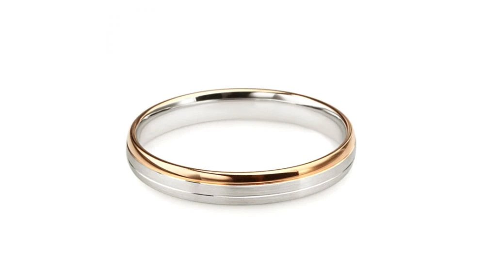 Deux couleurs pour une alliance, deux ors indéfectiblement liés. Une bague pour vous monsieur, toute en charme et complicité, pour une union partagée. Cette bague se compose d'or blanc et rose 18 carats (3.2 grammes de métal) de type brossé et poli. De forme bombée, elle est confortable à porter via ses finitions intérieures très soigneuses.