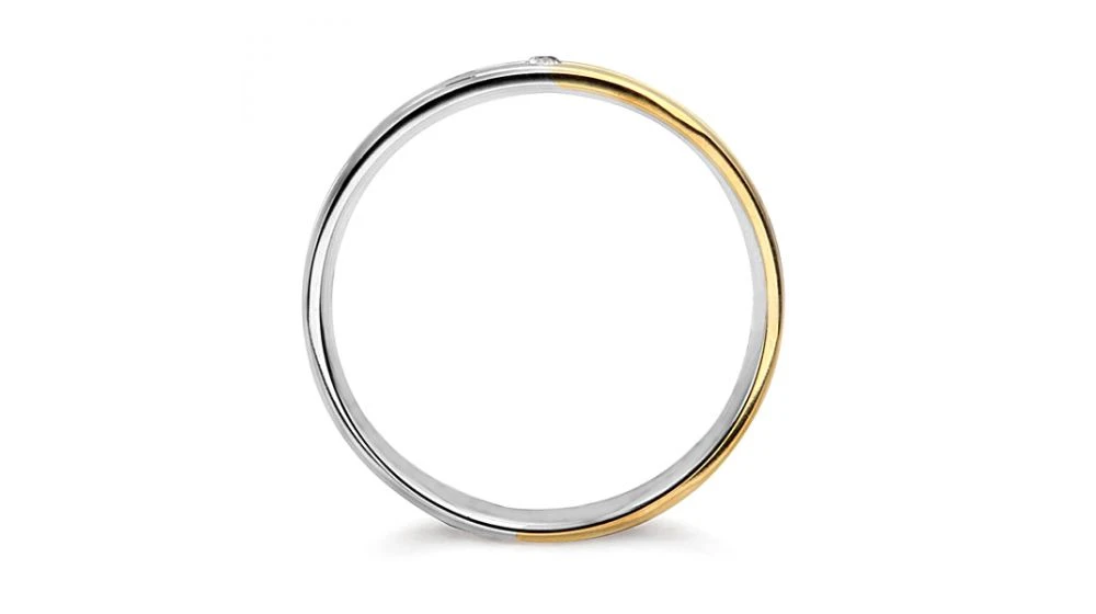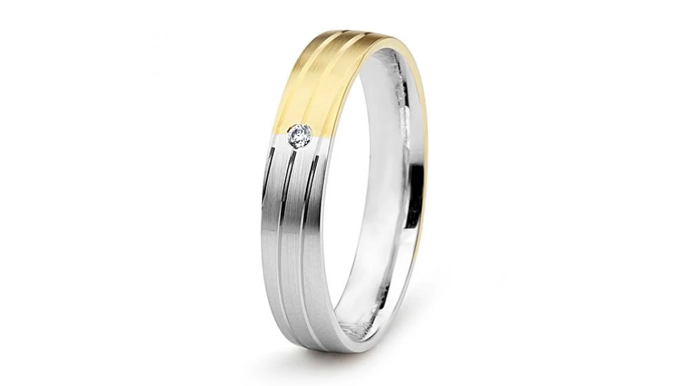 Alliance de mariage originale (pour femme) en or jaune et blanc 18 carats d'une épaisseur de 4mm. Son motif présente des rainures parallèles positionnées légèrement en oblique, donnant ainsi l’impression d'un mouvement perpétuel. Le poids de l'or est de 4.20 grammes. L'alliance est sertie clos d'un diamant (de taille ronde) d'un poids de 0,01 carat. Finition intérieure grand confort.