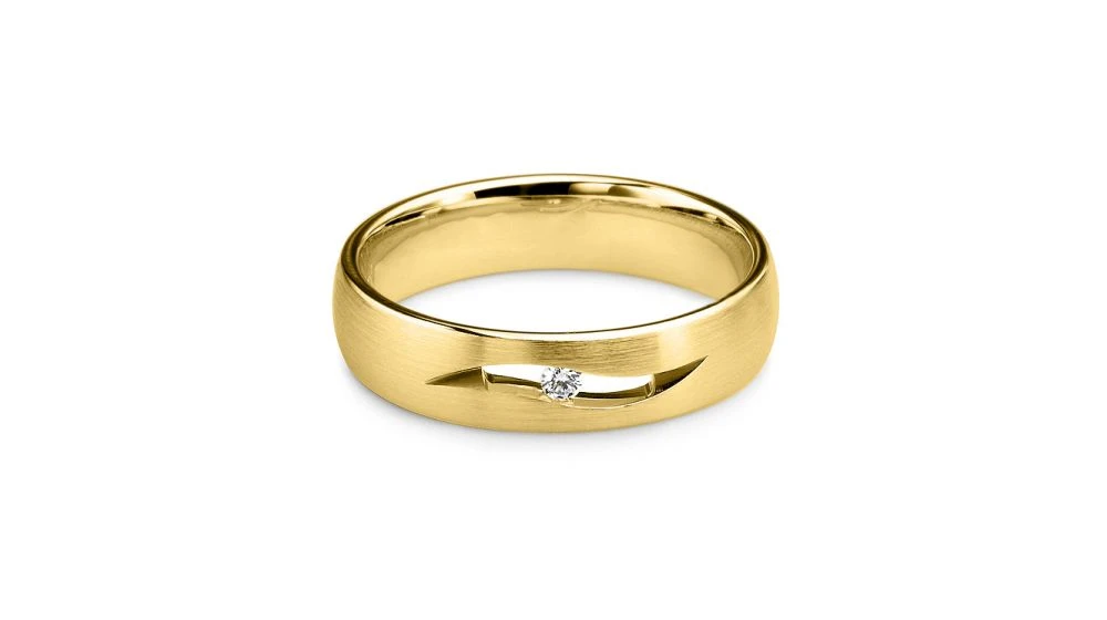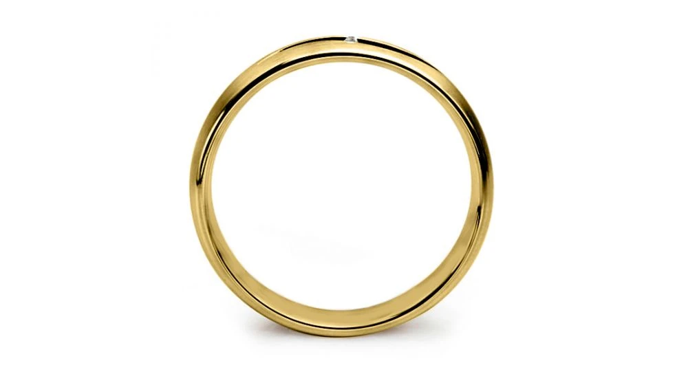 Lignes pures et courbes donnent à cette alliance en or jaune un style contemporain empreint de douceur. Madame sera ravie. La bague présente une originalité via un découpage stylistique. En son sein se loge subtilement un diamant serti demi-clos de 0.03 carat. Le poids en or de cette alliance est de 5 grammes. Sa largeur est de de 5mm de diamètre. La finition intérieure est très soignée ce qui permet un port confortable. Enfin, le corps de cette alliance présente une forme semi-plate avec des finitions extérieures brossées et polies.