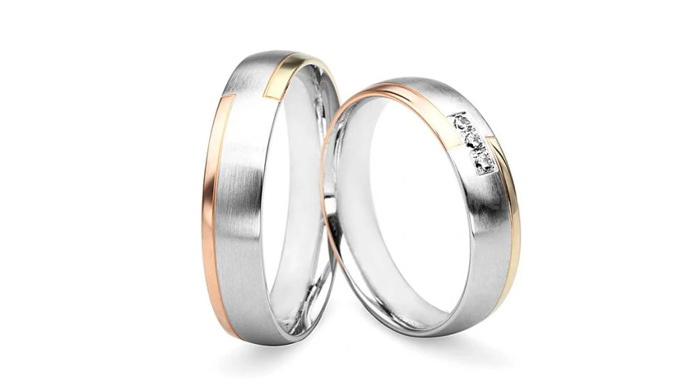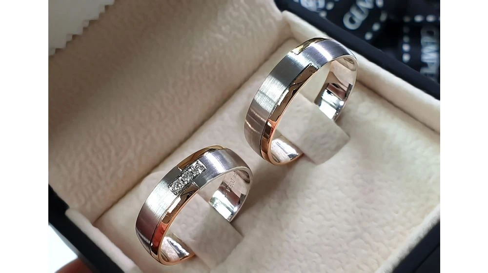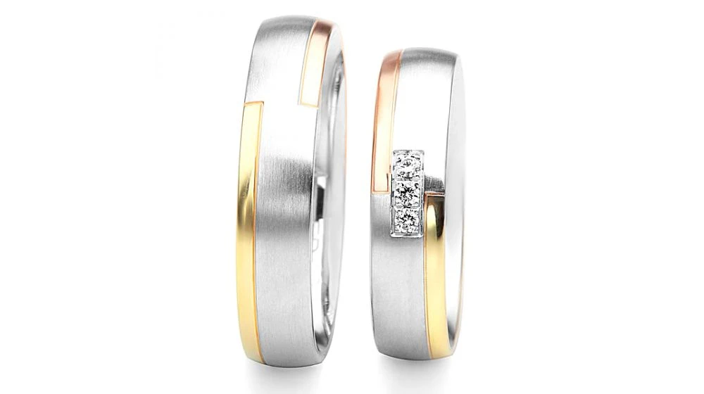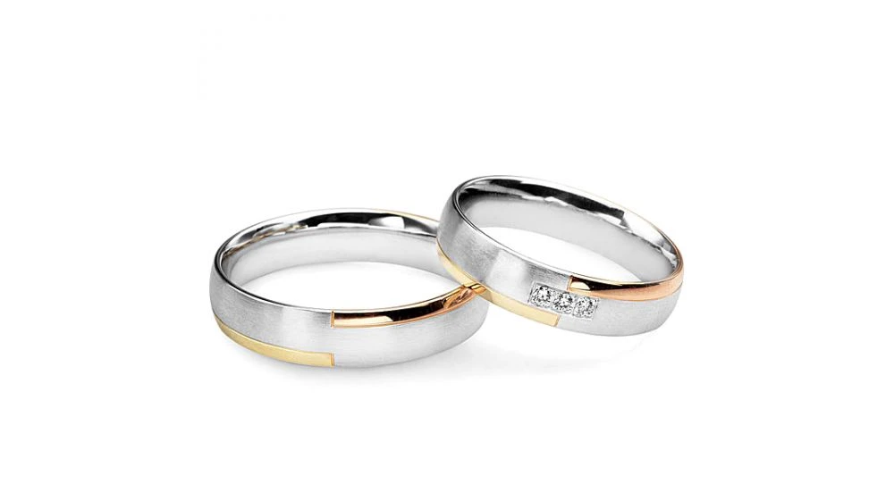 Depuis les rebords de ces alliances se rejoignent de fins liserés d'or jaune et rose 18 carats. Les corps principaux des bijoux sont rehaussés (alliance Femme) ou non (alliance Homme) de diamants situés au point de rencontre des métaux précieux. Le point de rencontre de votre amour …