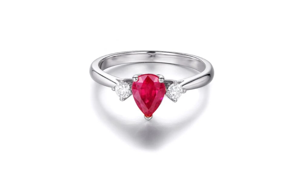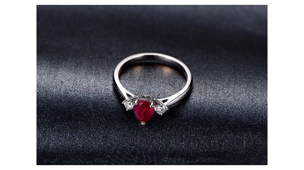 Inspirée par l'amour, Gemperles a créé cette bague en Or blanc 18 carats de type solitaire accompagné. Sa pierre centrale, un rubis, est taillé en forme de poire. Elle est sertie 3 griffes et pèse à elle seule 1.0 carat. À ses côtés, 2 diamants sertis griffe de 0.10 carat. Amour, quand tu nous tiens, Un bijou à l'éclat sublimé de 3 pierres de 1.10 carats.