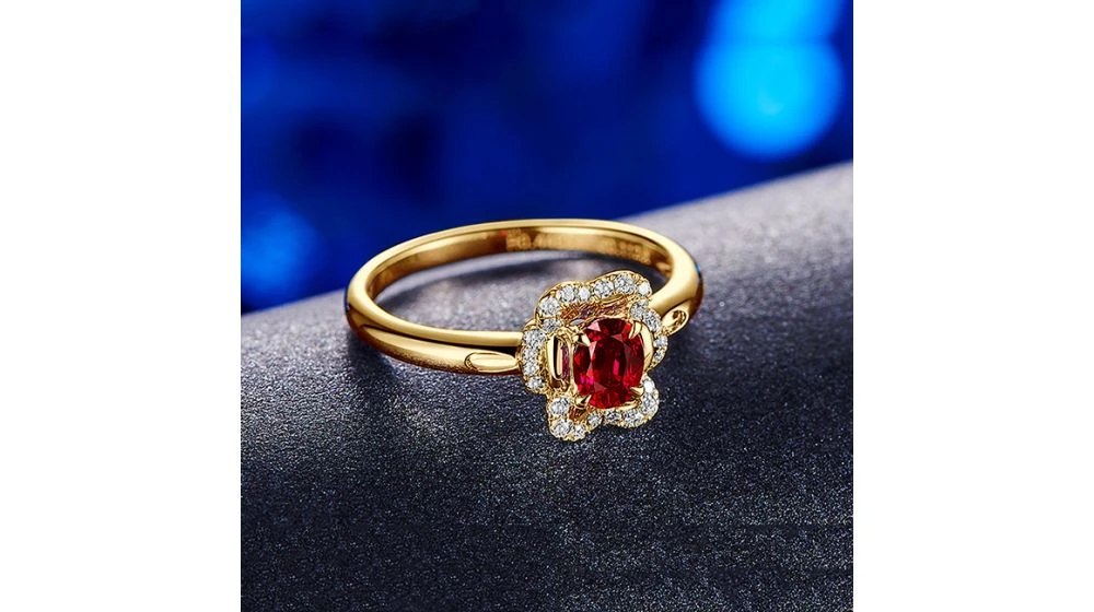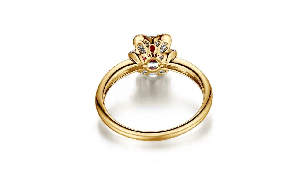 Flamenca ! Flamenca… de ton acte gestuel, virtuose et chorégraphique, ton acte au caractère brut et profondément viscéral, tu révèles ton art, celui de la danse et du spectacle. Tu es devenu incontournable et tu transcendes les malentendus. La danse Flamenca, c'est bien plus qu'une féria. Gemperles rend hommage à la Danse Flamenca, art du mouvement. Ici représentée par une bague en or jaune 18 carats et rubis formant une fleur de flamenco que l'on imagine aussi accrochée aux cheveux. Le coeur resplendit avec son rubis ovale rouge vif d'un demi-carat en provenance de Birmanie. 26 pétales de diamants taillés en brillant couronnent cet ensemble merveilleux.