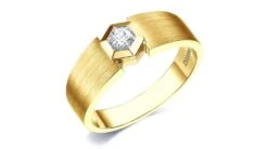 <p>Bague pour homme en or jaune brossé et poli. L'encadrement hexagonal au centre du bijou révèle un diamant solidement serti de 6 grains.</p> <p>Composée d'une étoile à 6 branches, cette bague symbolise le macrocosme, le divin ou encore le spirituel.</p>
