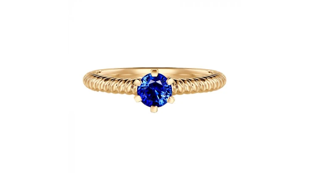Mariamman, tirée du nom d'une déesse-mère de L'Inde du Sud, est une superbe bague en or jaune 18 carats montée d'un saphir bleu du Sri Lanka. Intense et prometteuse, Mariamman saura mettre en valeur votre main grâce à sa monture présentant un aspect torsadé. Elle délivre un message de luxe et modernité via son saphir serti 6 griffes d'un poids de 0.55ct.