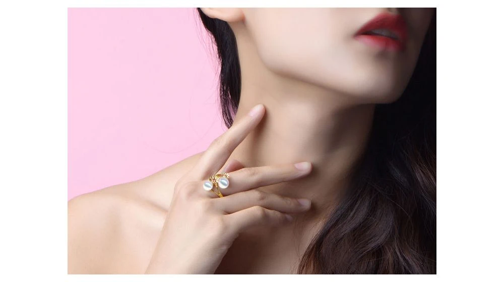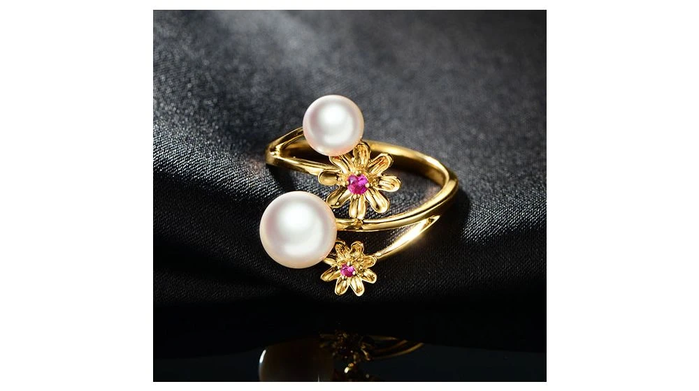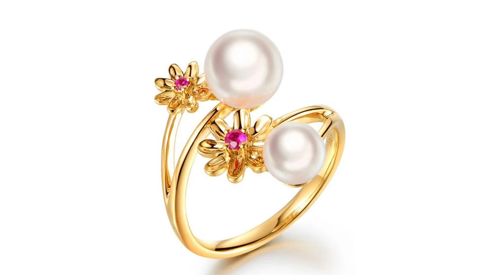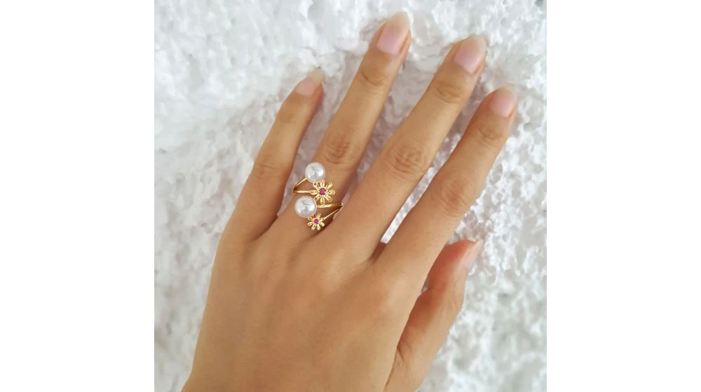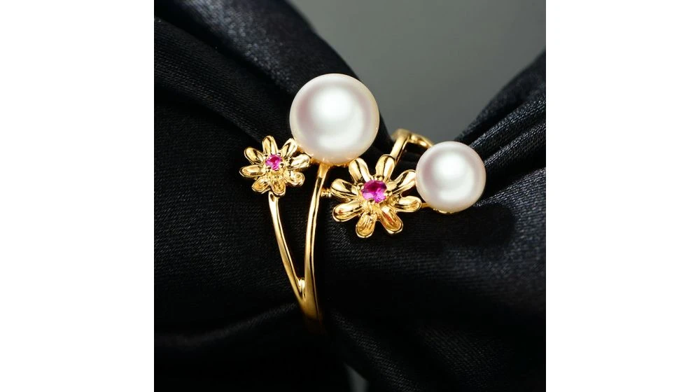 Bague Or Jaune Toi Et Moi Perles Akoya. Fleurs, Saphirs Roses