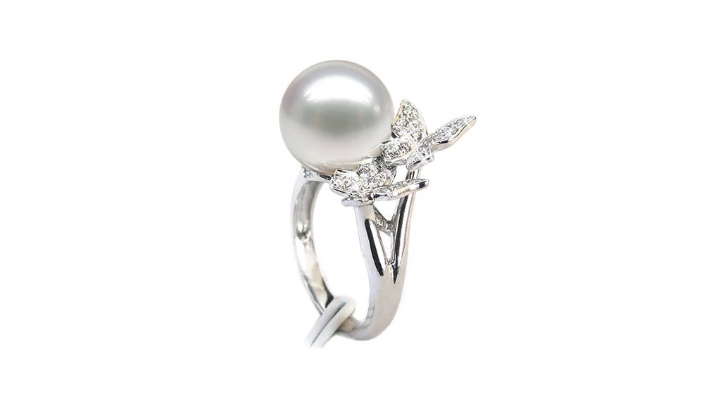 Perle d'Australie blanche montée sur une bague en or blanc sertie de diamants. Deux gracieux papillons juxtaposent la perle de qualité GEMME.