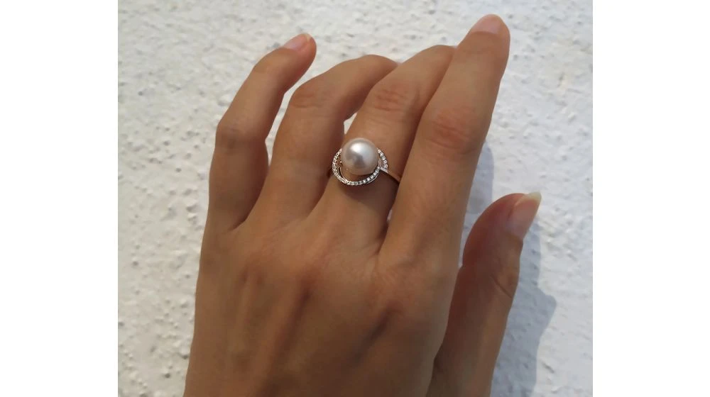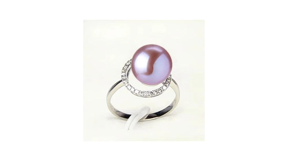 Bague en or blanc et perle de culture d'eau douce. La légèreté de sa monture se décline en une base qui s'enroule et encercle la perle. Les diamants sont taillés brillant et micro sertis griffes. La perle possède un lustre très brillant et se distingue par sa qualité AAA. Elle possède un diamètre compris entre 9 et 9.5mm.