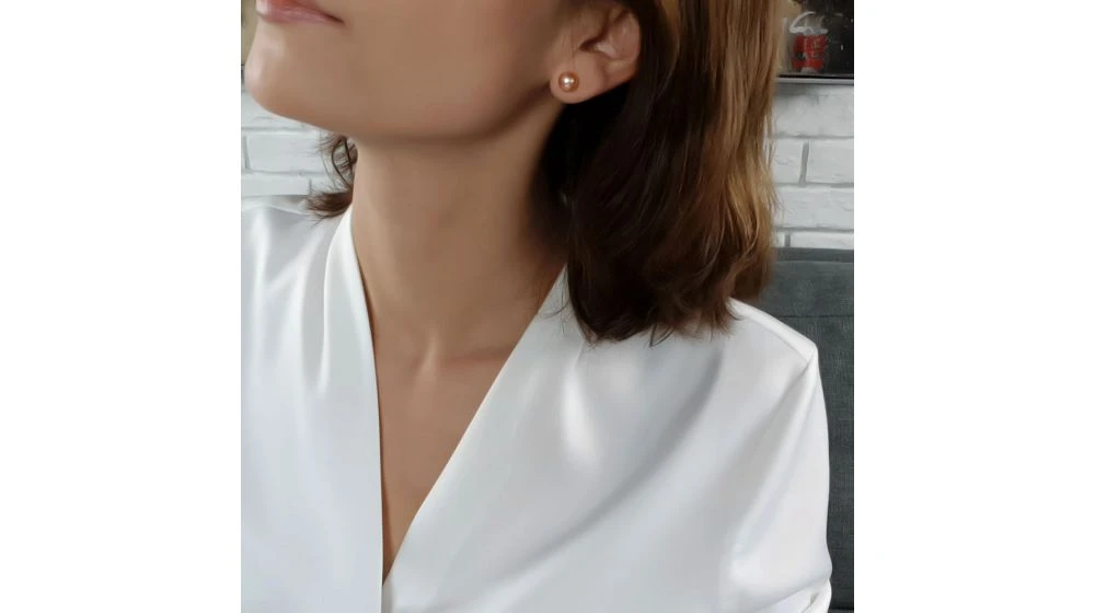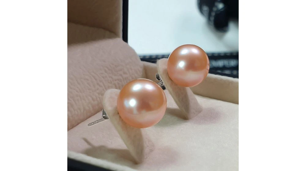 Boucles D’oreilles Clous. Perles Roses 8/9mm. Or Blanc