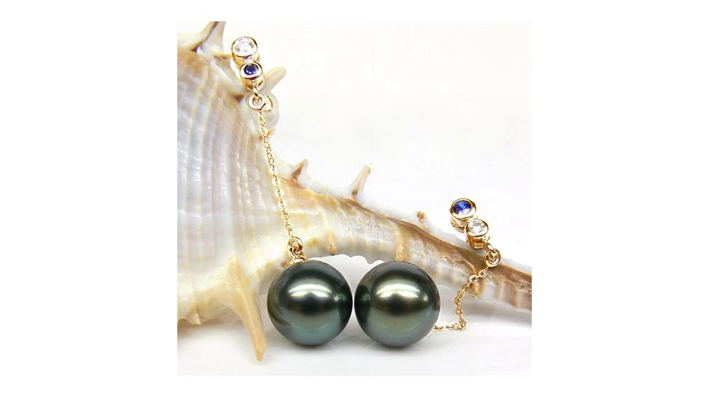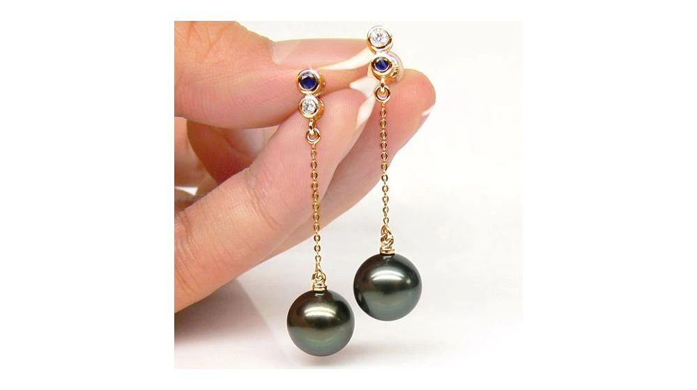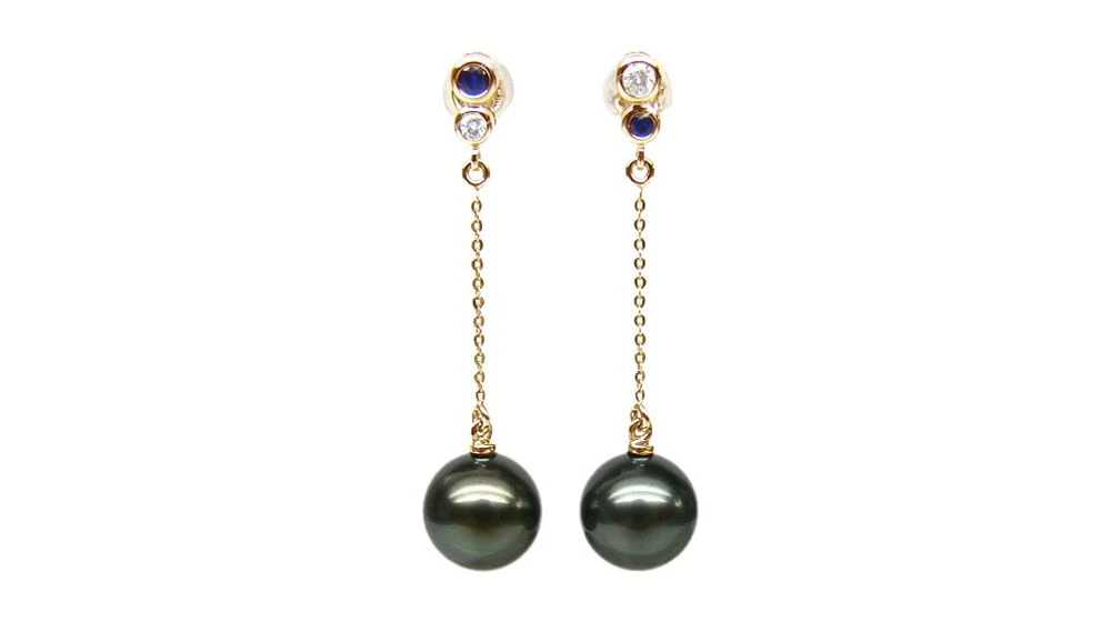 Boucles D’oreilles En Or – Perles De Tahiti – Or Jaune, Diamants, Saphirs