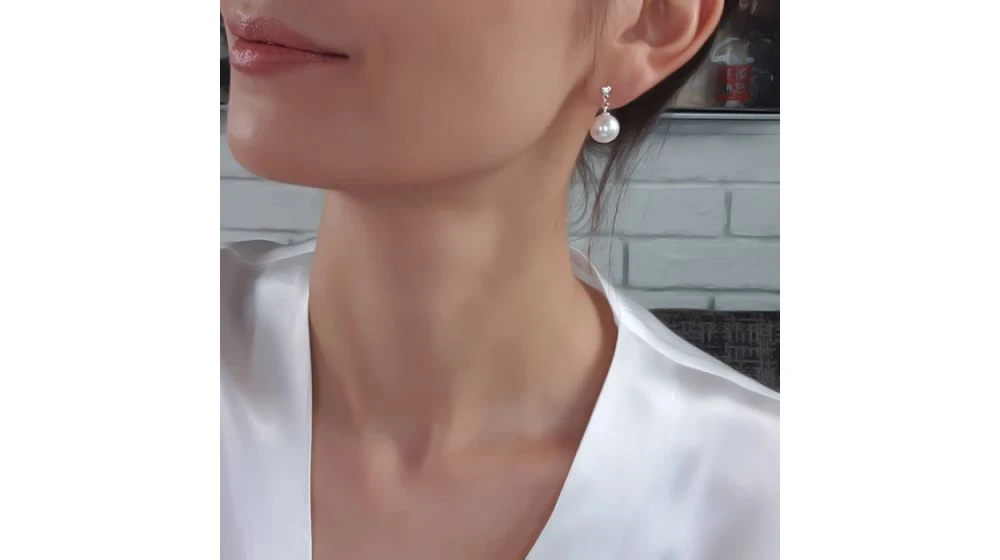 Pendants d'oreilles en perles de culture de Chine blanches. Leurs montures, en or blanc 18 carats, sont composées de deux diamants sertis clos, tour à tour encerclées par un disque. Les perles d'eau douce sont solidement fixées en suspension et reliées aux boucles via deux chaînettes. Elles possèdent un diamètre compris entre 9 et 11mm ainsi qu'une belle qualité AAA.