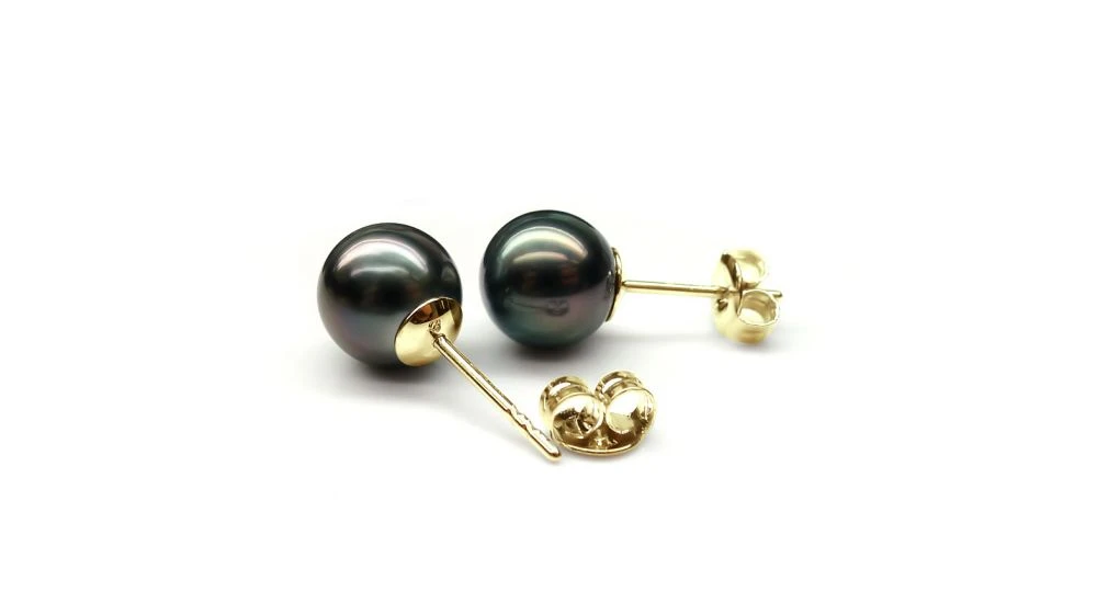 Boucles Oreilles Clous Or Jaune. Perles De Tahiti Noires