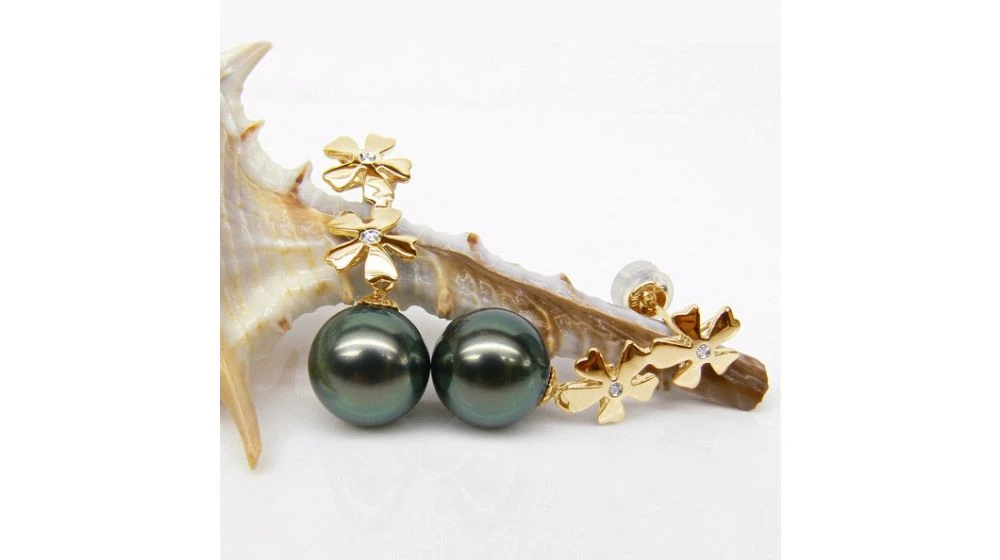 Boucles Oreilles Fleurs – Pendants Perles Tahiti Bleus Vertes – Or Jaune