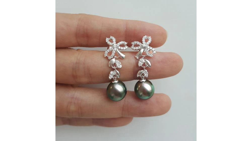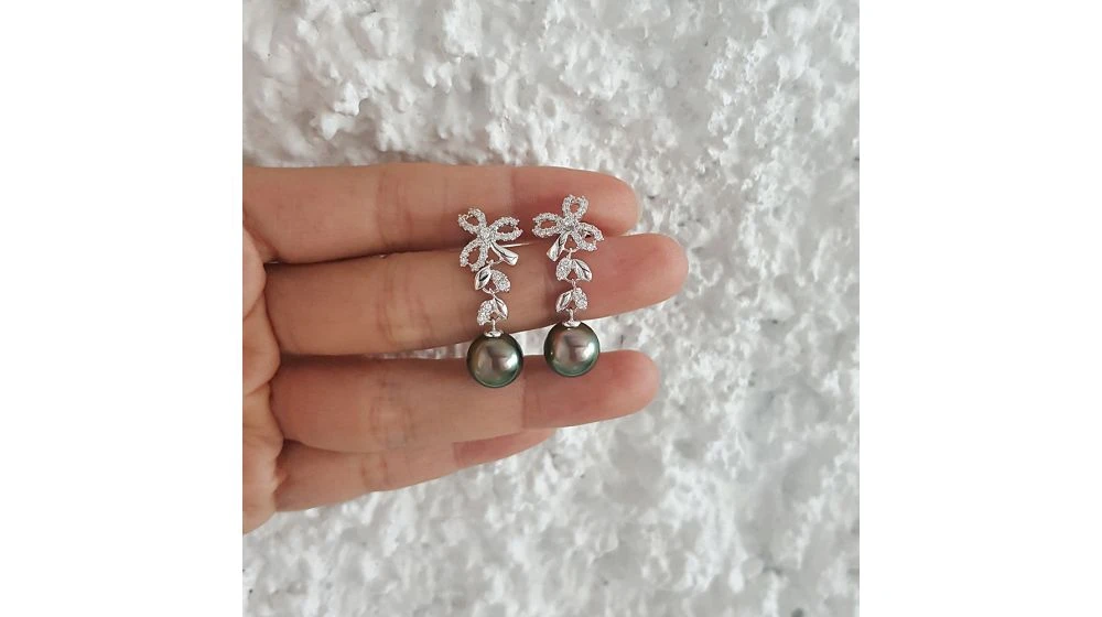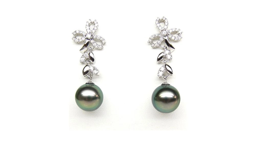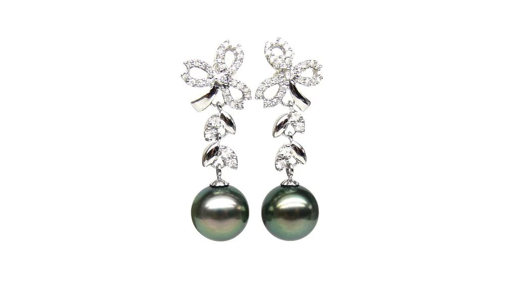 Boucles Oreilles Or Blanc – Perles De Tahiti – Diamants – Composition Florale