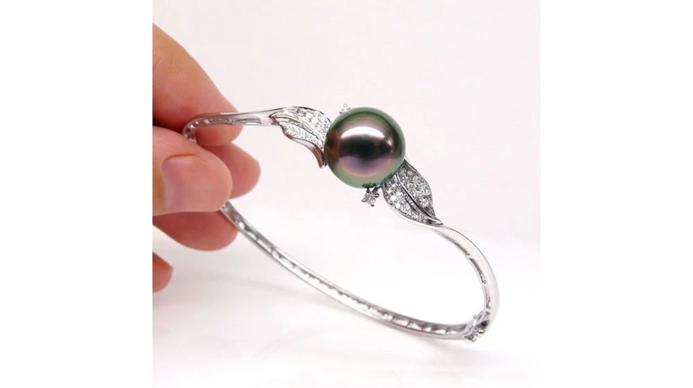 Bracelet Jonc – Perle De Tahiti – Pavage Feuilles – Or Blanc, Diamants