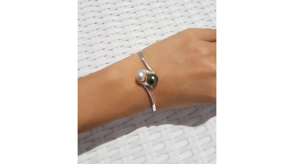 Perle de Tahiti noire et perle d'Australie blanche You and Me montées sur un bracelet jonc de constitution rigide. Il est composé d'or et pavé de diamants. Ces deux perles sont de qualité top gemme. Nous proposons au choix deux diamètres de bracelet ; 55mm (55×50) pour l'un et 60mm (60×55) pour l'autre.