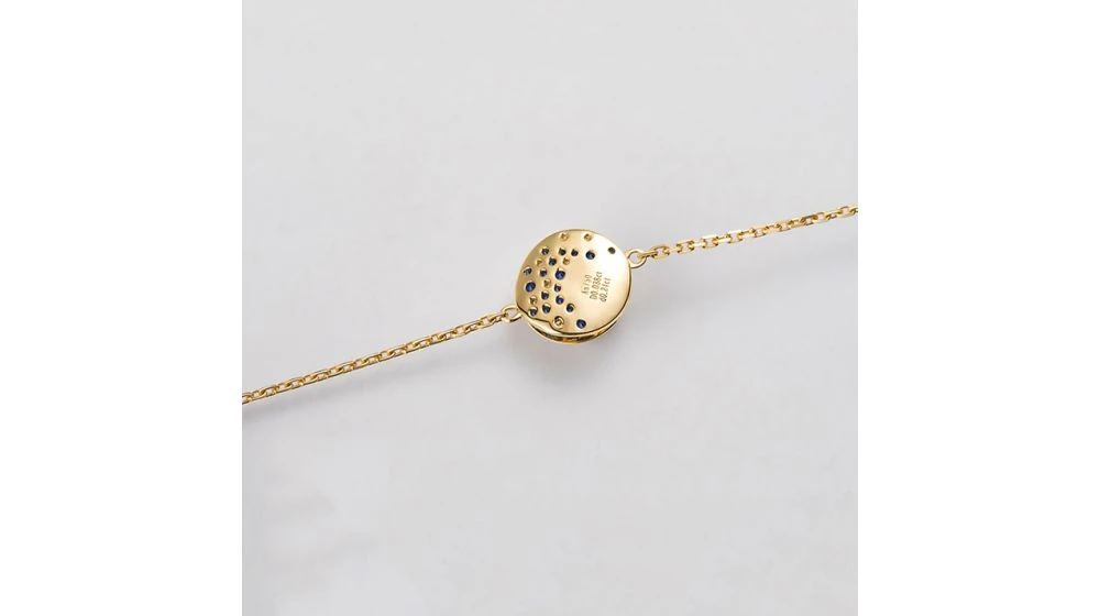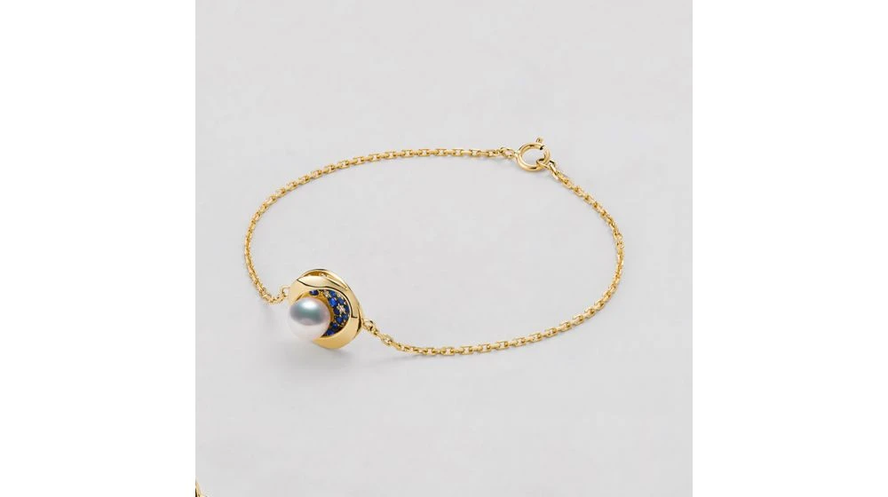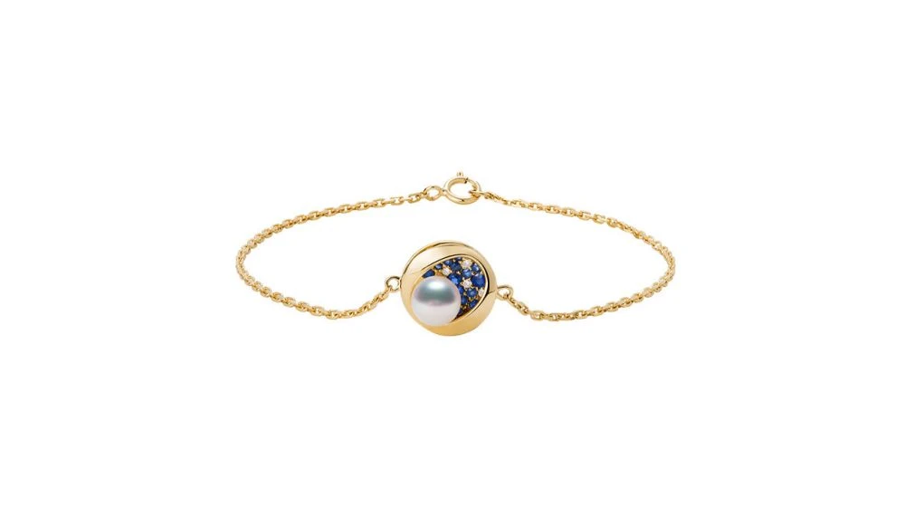 Seiza scintille comme une constellation d'étoiles qui se projetterait radieusement au sein de la voûte céleste. Seiza (qui signifie constellation en japonais) est généralement visible sur fond de ciel nocture mais ici, elle rayonne de mille feux de jour comme de nuit… Le bracelet présente un design original mariant les couleurs du jaune métallisé, jaune nacré, blanc brillant et bleu saphir… Un mélange détonnant dégageant un style singulier. L'or jaune généreux du métal vient chalouper une perle Akoya AAA du Japon (de diamètre 5/5.5mm) venant se lover sur sa monture. Seiza comporte une myriade de diamants et saphirs pour un total de 0.274 carat environ.