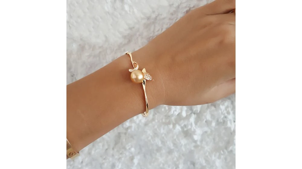 Bracelet Végétal Jonc Or Jaune – Perle D’Australie Dorée – Diamants