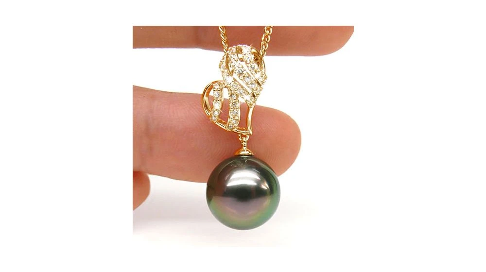 Pendentif stylisé en forme de cœur, orné d'une perle de Tahiti noire (ton paon). La perle possède un diamètre compris entre 11 et 12mm et se distingue par sa qualité top gemme. La bélière est composée de métal or jaune 18 carats et subtilement barrée de 29 diamants.