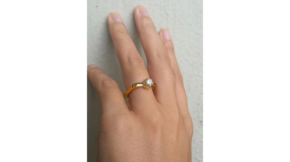 Avec Léna Gemperles livre une version du solitaire élégant et contemporain. Essentielle, intemporelle, la ligne originale de cette bague met en valeur 6 griffes au design affirmé. Composée d'or jaune 18 carats (poids en or : 5.1 gr), elle est montée d'un diamant central de 0.40 carat (de pureté VS et de couleur G). 10 diamants secondaires de 0.07 carat enrichissent ostensiblement la monture. Ce solitaire totalise ainsi 11 diamants pour un poids de 0.47 carat. Particularités : Le solitaire devient pendentif via le coulissement ingénieux de son chaton.