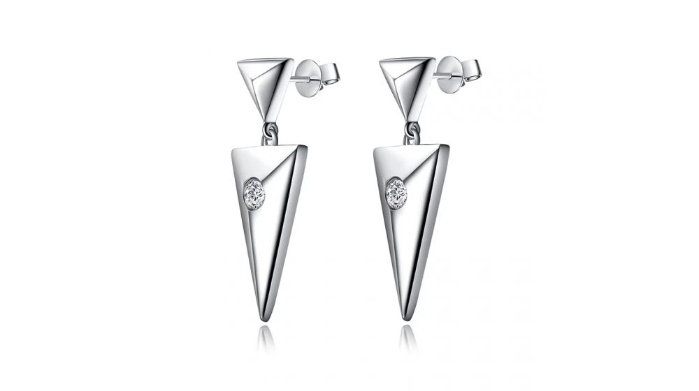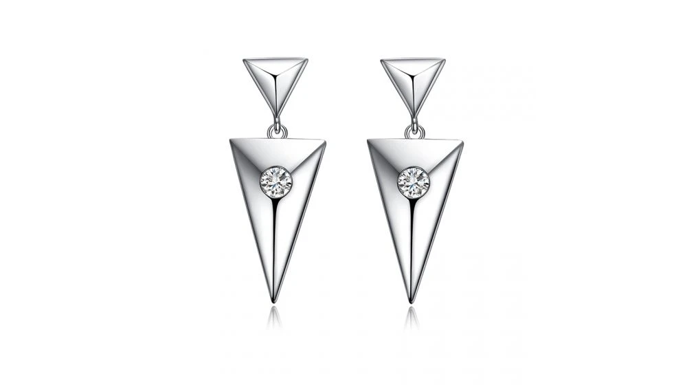Klara, un style triangulaire en pyramide inversée. Des boucles avant-gardistes aux multi-facettes et à la forme pointue. Chaque pendant de ces boucles d'oreilles présente 2 triangles en Or blanc 18 carats en position renversée et relié par un petit anneau. Ils sont incrustés de 2 diamants de 0.10ct (0.05ct x 2) sertis clos. Un mot sur les fermoirs : Les boucles sont de de type clou et traversent les oreilles via deux tiges. Elles sont maintenues par une fermeture confortable en forme de papillon. Deux crans sur chaque bout de tige sécurisent le port. Pour une protection encore plus poussée, vous pouvez opter pour les Alpa.