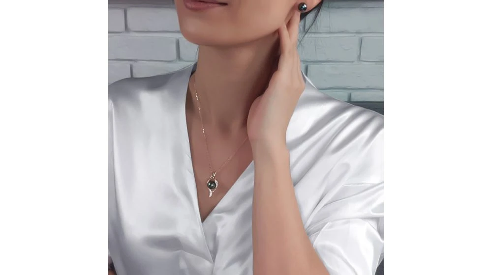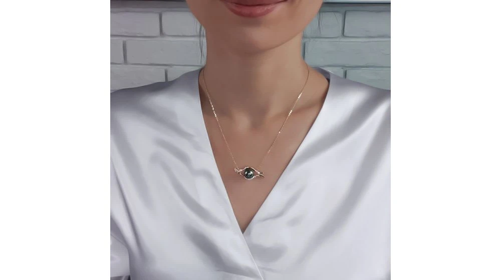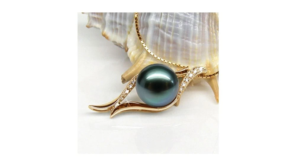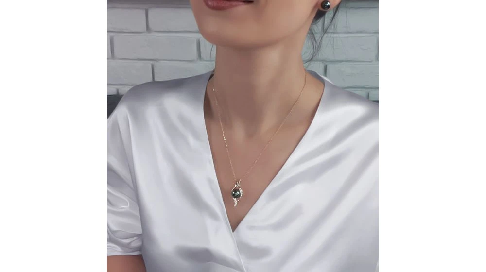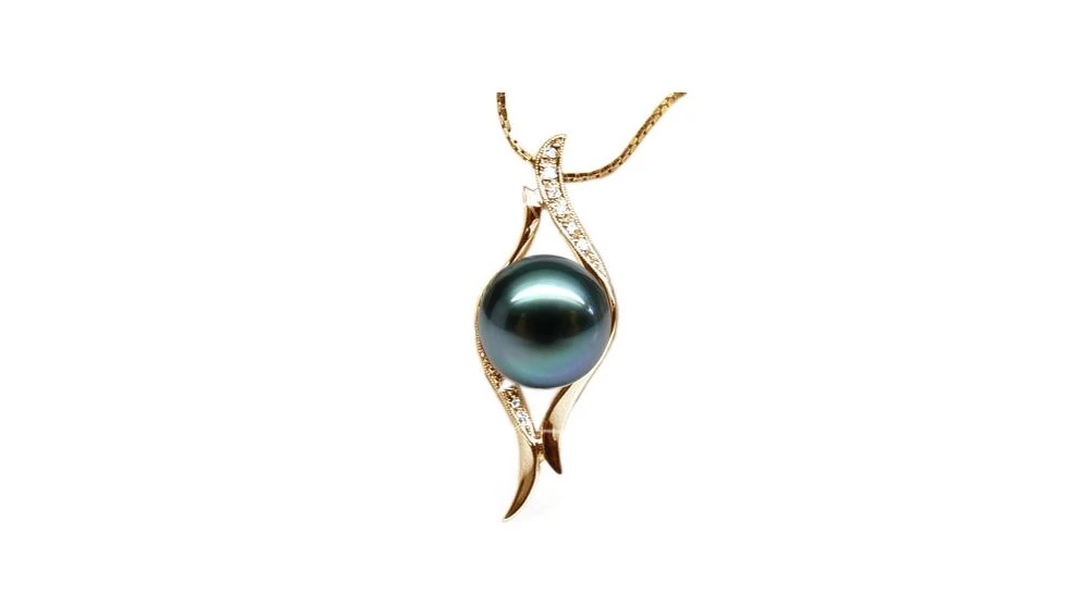Perle de Tahiti de qualité top gemme (noire, tons bleus), coiffée de barrettes incurvées en métal or jaune. La bélière est composée de diamants sertis clos, taille brillant (ronds). Un pendentif teinté de modernité, tout en charme.