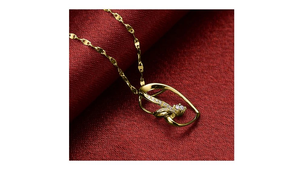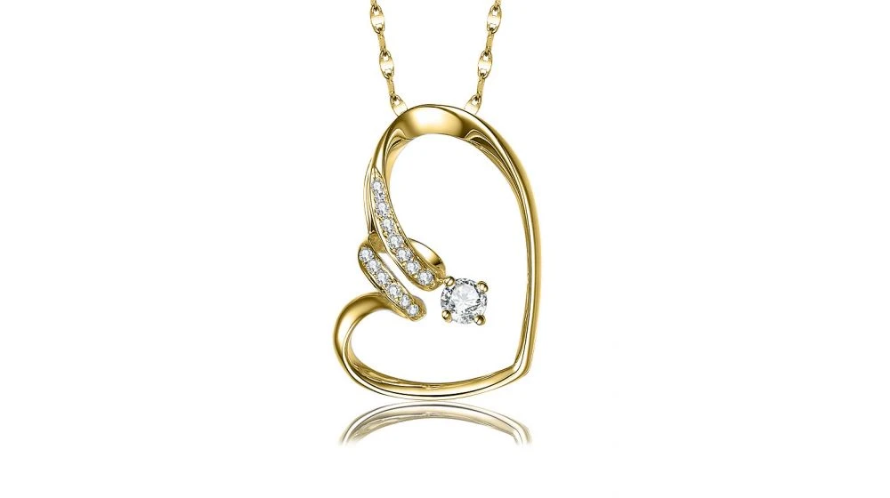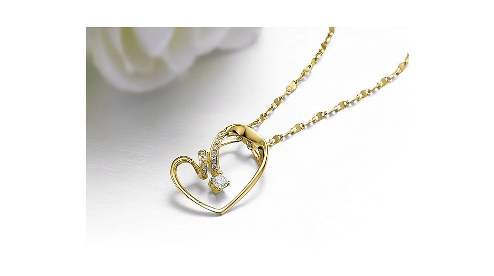 Pendentif or jaune et diamants. Les ondulations de métal forment joliment un cœur dont le style n'est pas sans rappeler l'aile gracieuse du papillon. Le diamant central serti 4 griffes (milieu du pendentif) pèse 0,05 carat. Il est soutenu par une sinuosité de 13 diamants sertis grains de 0,03 carat. Le bijou présente un total de 14 diamants de 0,08 carat.