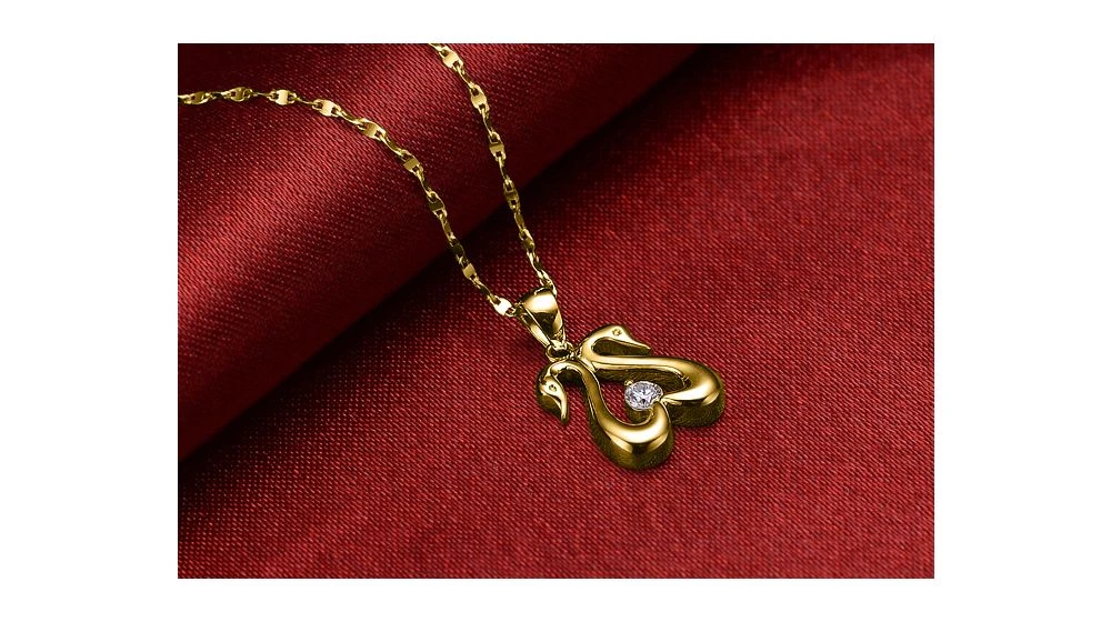 Pendentif en or jaune 18 carats représentant un couple de cygnes unis. Au centre se profile une formation en cœur inversé. Ce bijou porteur d'une symbolique forte est serti d'un diamant (de taille brillant) pesant 0.10 carat.