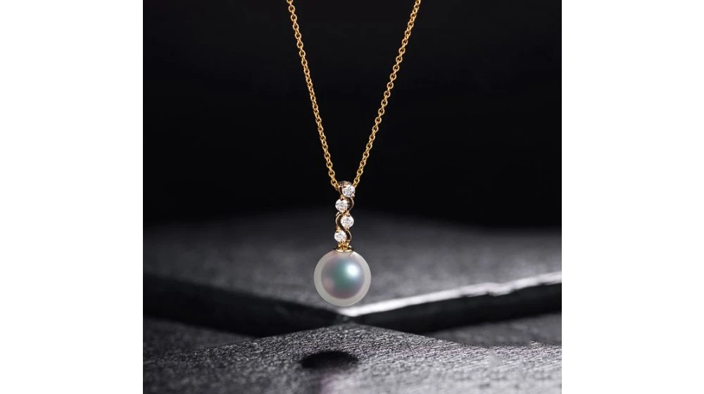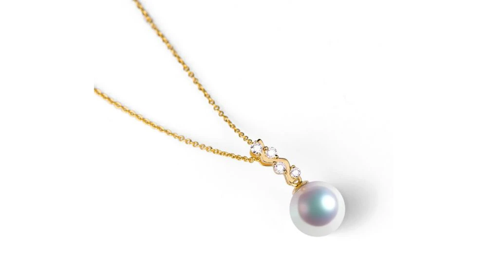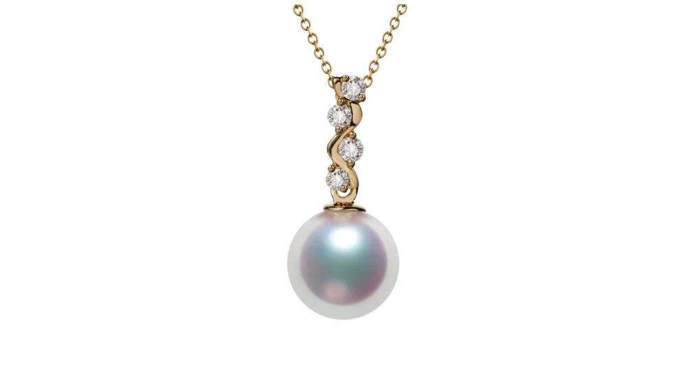 La danse du serpent… en japonais, Sun?kudansu Entraînante, sautillante, c'est la danse du serpent, Du serpent qui se déroule et s'enroule en sifflant, Du serpent qui se faufile et qui file vivement. Ce pendentif au design unique présente une bélière en Or jaune à la forme sinueuse (telle un serpent), se tanguant entre 4 diamants de 0.10 carat. Une perle Akoya du Japon AAA, de 8/8.5mm (et aussi 8.5/9mm en option) met gracieusement en valeur l'ensemble. Dotée d'un surface lisse et d'un lustre particulièrement élevé, elle est véritablement proche de la perfection.