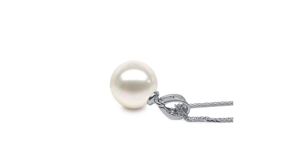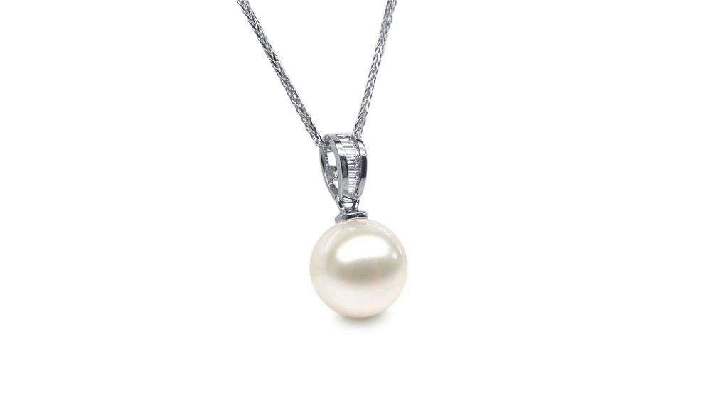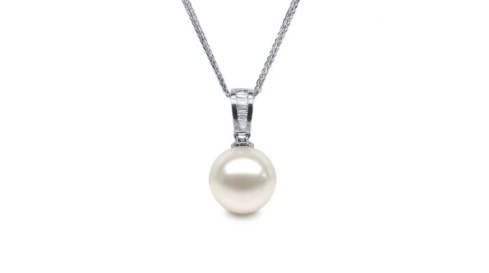 Pendentif sobre et raffiné représentant une bélière en or blanc 18 carats. Il est serti de 8 diamants de taille émeraude. La bélière met en valeur une perle de culture blanche en provenance de Chine de qualité AAA.