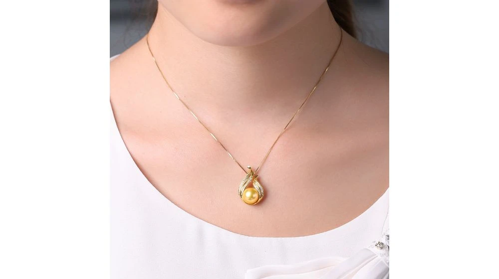 Pendentif Douce Végétale – Perle Dorée – Or Jaune, Diamants