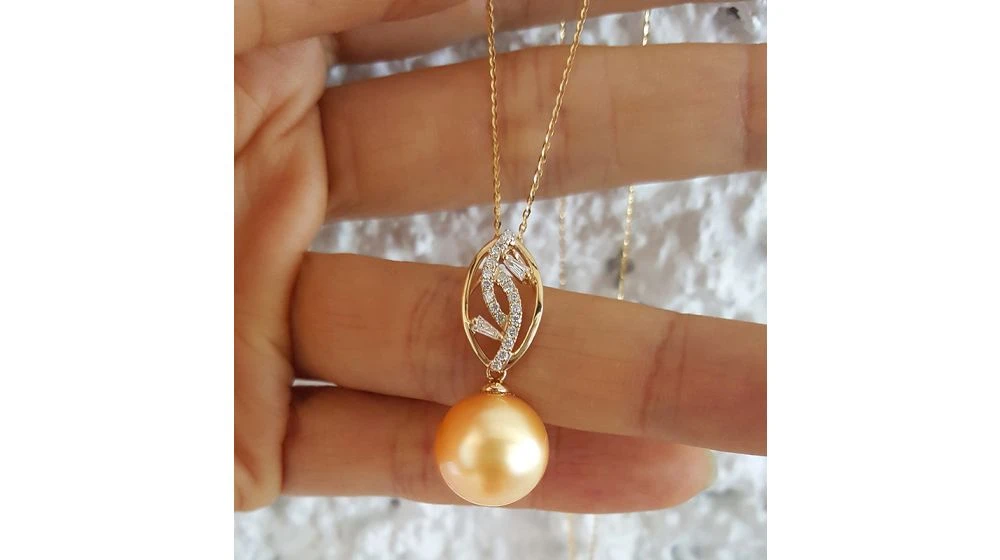 Pendentif Feuilles D’or Diamantées – Perle D’Australie Dorée