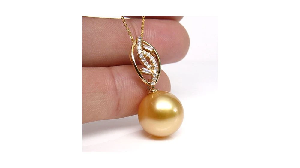 Imposante perle d'Australie dorée montée sur une bélière formée de deux feuilles. La perle mesure précisément 12/13mm et de qualité GEMME. Le pendentif est composé d'or jaune 18 carats et comporte deux rangées de diamants (taille brillant et sertis micro griffes) positionnées sur les contours intérieurs de la bélière. Deux diamants baguettes se placent en diagonale, tout en originalité.