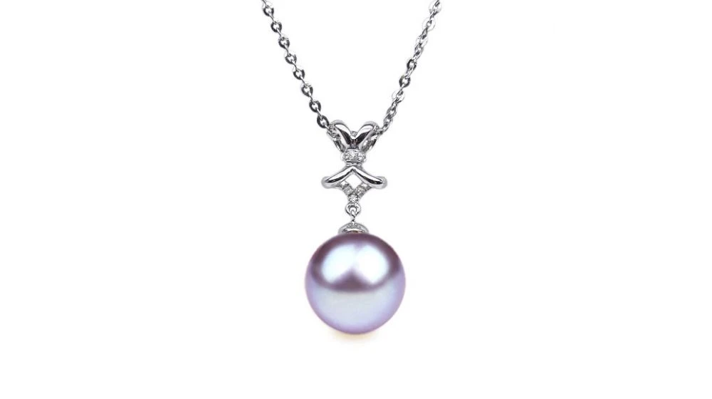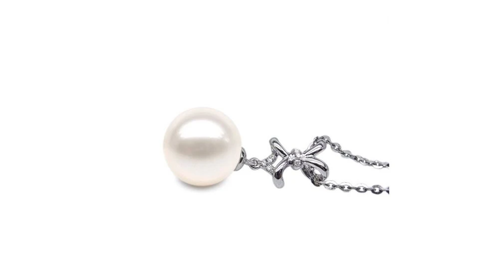 Pendentif en or blanc formant une ganse classique. Il est finement sertie de 6 diamants et se monte d'une perle de culture d'eau douce blanche de qualité AAA. La perle s'impose par son diamètre imposant de 10/10.5mm et harmonise la parure avec prestance.