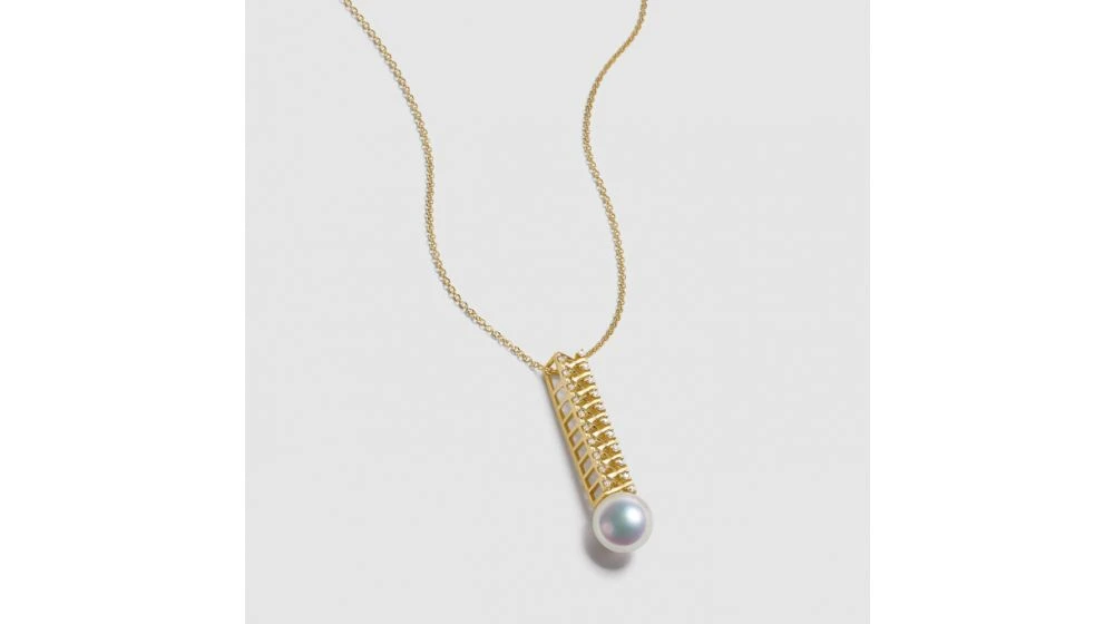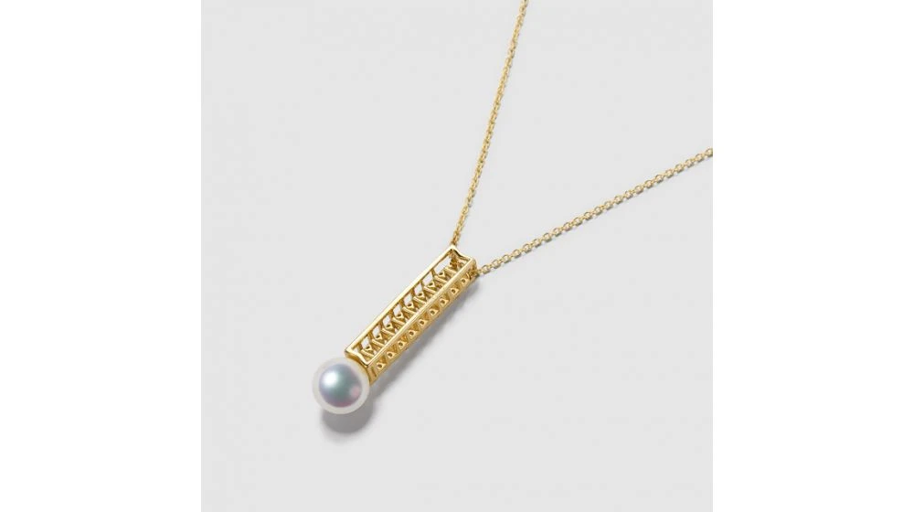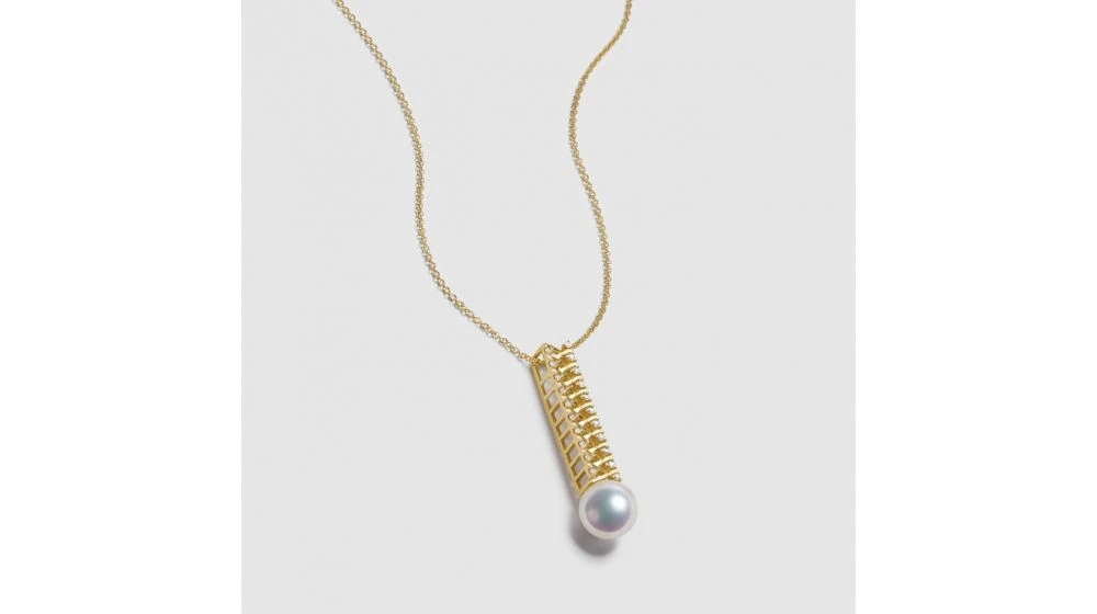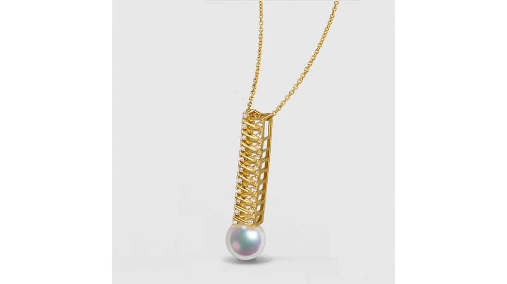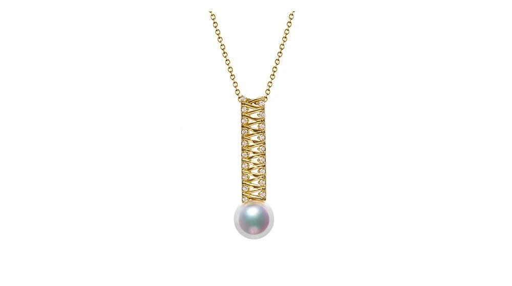 Hatsune Miku est une pendentif gracieux composé d'or jaune 18 carats, diamant et perle dont le design en verticalité s'apparente à une torsade croisée. La bélière en impose véritablement par son élégance sobre et naturelle, son port confortable… les 21 diamants joliments disposés sont pavés en parallèle. À son bout est monté une perle Akoya blanche de qualité AAA. Son diamètre démarre à 8/8.5m (et jusqu'à 8.5/9mm en option).