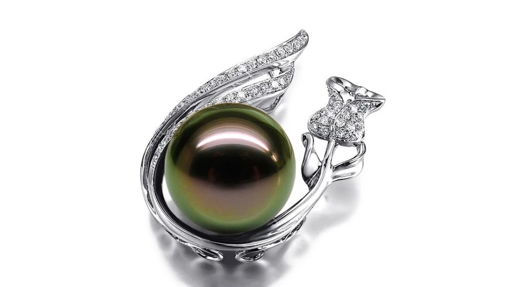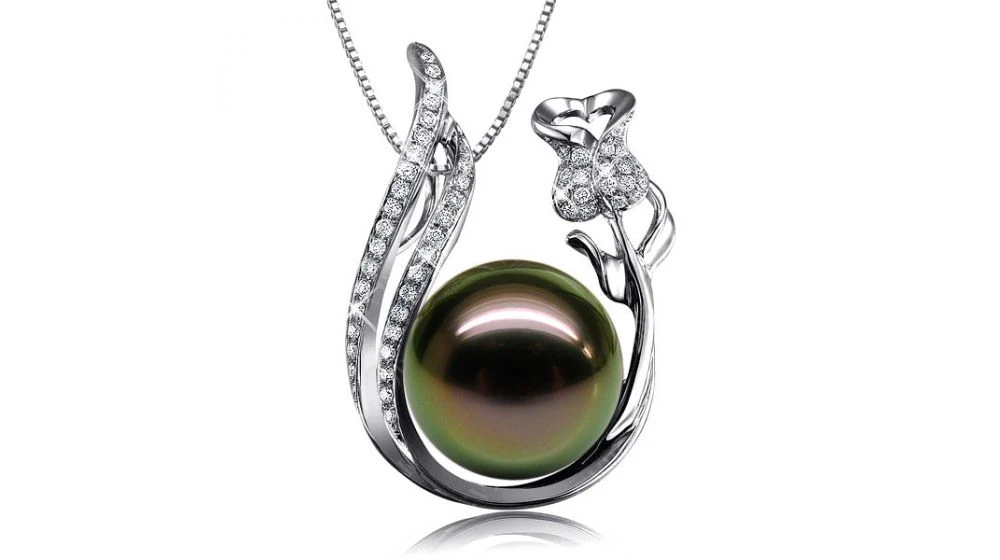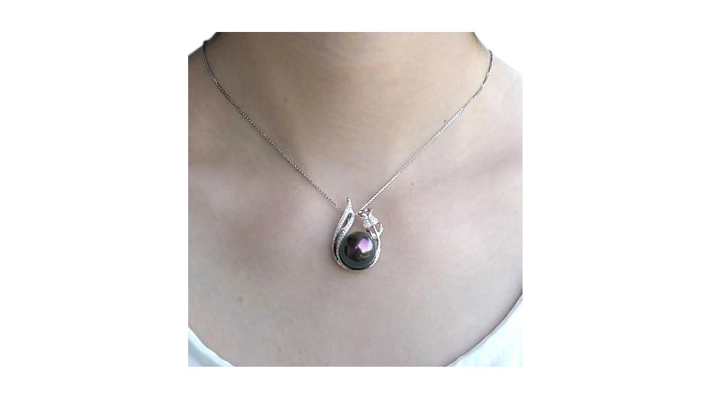 Pendentif Rose – Perle Tahiti Noire – Or Blanc, Diamants – La Vie En Rose