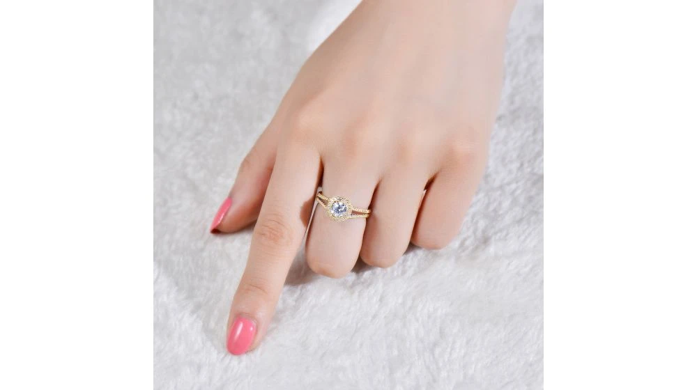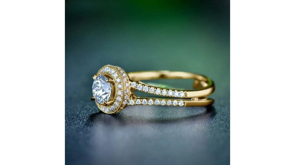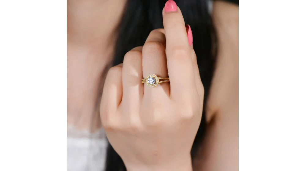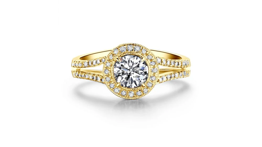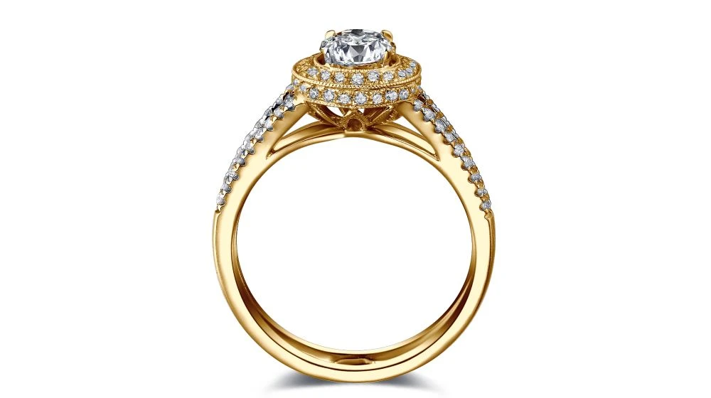 Tout en volumes ouvragés, ce solitaire accompagné pour femme est une véritable œuvre d’art. Comme un dahlia jaune trouve sa place au centre du bouquet de la mariée, cette bague magnifique par son opulence attire l’œil et les faveurs des plus audacieux futurs jeunes mariés. Son anneau en or jaune 18 carats n’en finit plus de se scinder puis de se rapprocher pour enfin se réunir sous une coupole de gemmes extravagante portant un diamant principal de 0,50 carat. Grâce à elle, un délicat jeu de lumière se forme. Ainsi, les pierres précieuses de cette bague de fiançailles reflètent, presque aussi bien que vous, la clarté ambiante.